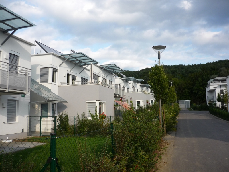 Bebauung der "Kickergründe" in der Radegunder Straße mit Niedrigenergiehäusern mit 54 voll- bzw. teilunterkellerten Wohneinheiten.